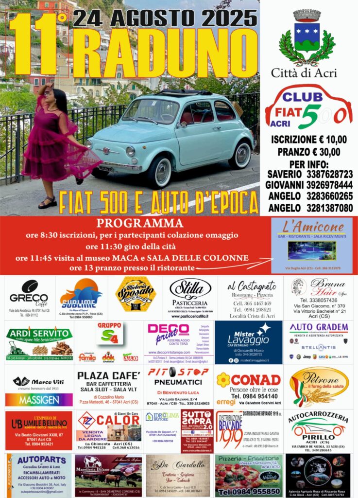 Undicesima edizione del Raduno di Fiat 500 e auto d’epoca, organizzato dal Club Fiat 500 Città di Acri. L’evento si terrà il 24 agosto 2025. Il programma prevede iscrizioni e colazione dalle 8:30, giro della città alle 11:30, visita al museo MACA e Sala delle Colonne alle 11:45 e pranzo presso il ristorante alle 13:00.
