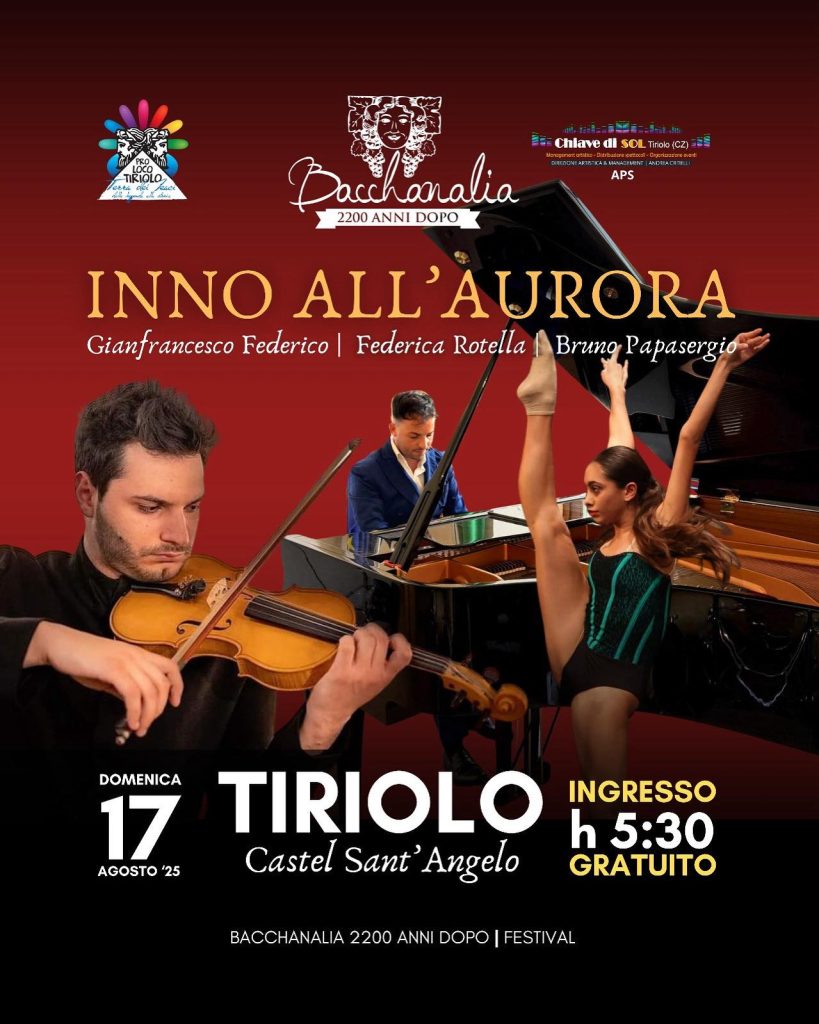 Spettacolo di musica e danza nell’ambito del festival “Bacchanalia 2200 Anni Dopo”. L’evento, intitolato “Inno all’Aurora”, vedrà la partecipazione di Gianfrancesco Federico, Federica Rotella e Bruno Papasergio. Si terrà a Tiriolo, presso il Castel Sant’Angelo, domenica 17 agosto 2025, alle ore 05:30. L’ingresso è gratuito.