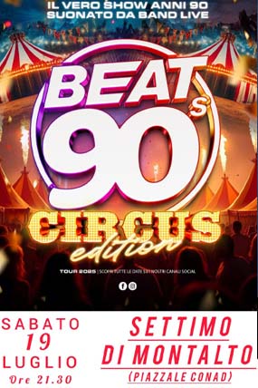 Il vero show anni ’90 suonato da band live, “Beat’s 90’s Circus Edition”. L’evento si terrà sabato 19 luglio 2025 alle ore 21:30 a Settimo di Montalto, in Piazzale Conad.