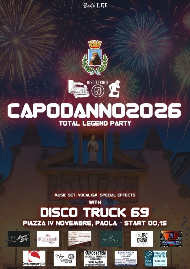 Festeggiamenti per il Capodanno 2026 a Paola con il “Total Legend Party”. La serata sarà animata dallo spettacolo del Disco Truck 69, che proporrà un’esperienza completa con music set, vocalism ed effetti speciali per celebrare l’arrivo del nuovo anno.