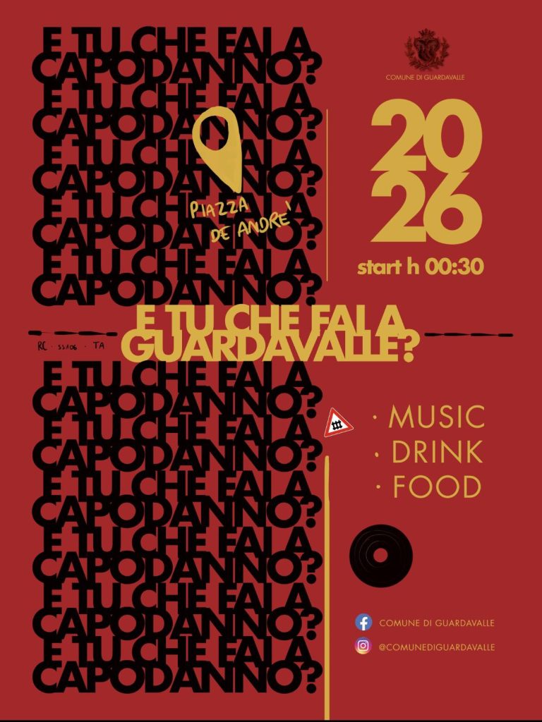 Il Comune di Guardavalle organizza i festeggiamenti per il Capodanno 2026. L’evento si terrà in Piazza De André a partire dalle ore 00:30 del 1° gennaio, con musica, drink e food per celebrare insieme l’arrivo del nuovo anno.