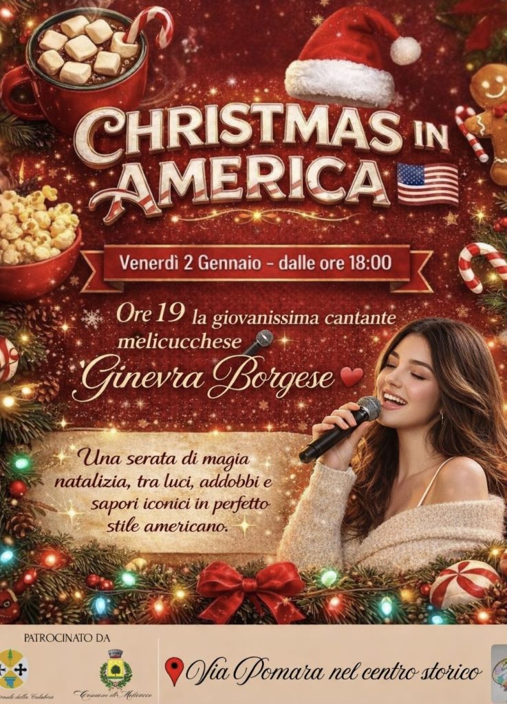 Una serata dedicata alla magia del Natale in perfetto stile americano, tra luci, addobbi e sapori iconici. L’evento avrà inizio alle ore 18:00 e vedrà la partecipazione della giovane cantante melicucchese Ginevra Borgese, la cui esibizione è prevista per le ore 19:00.