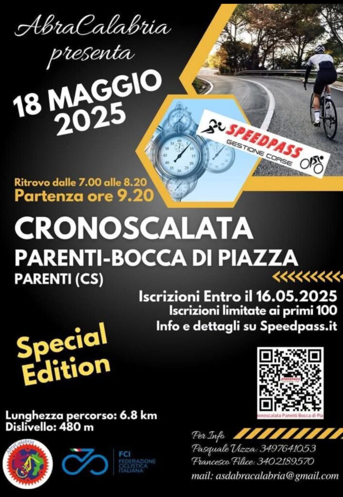 CRONOSCALATA PARENTI-BOCCA DI PIAZZA (PARENTI-CS). Iscrizioni Entro il 16.05.2025. Ritrovo dalle 7.00 alle 8.20. Partenza ore 9.20.