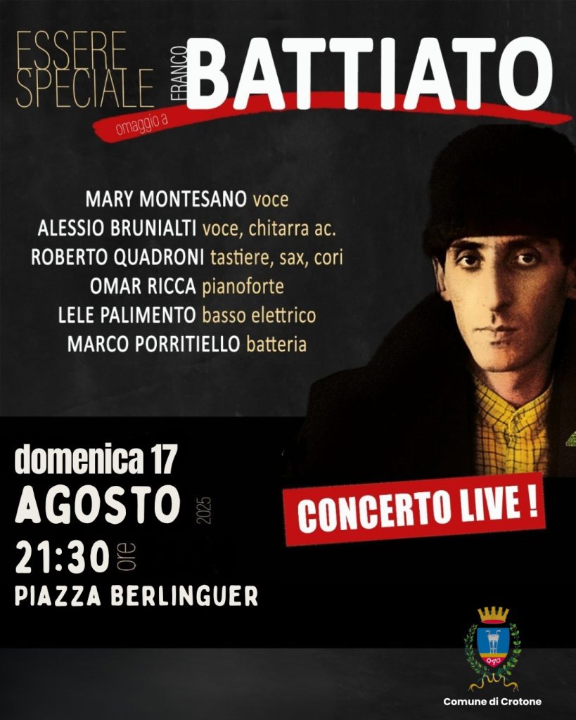 Concerto tributo a Franco Battiato. Lo spettacolo “Essere Speciale” si terrà domenica 17 agosto 2025, alle ore 21:30, in Piazza Berlinguer a Crotone. Sul palco si esibiranno diversi musicisti per omaggiare il grande cantautore.