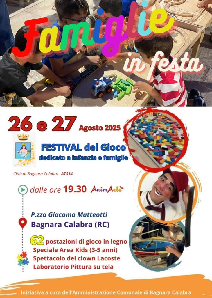 Festival del Gioco “Famiglie in Festa”, dedicato a infanzia e famiglie, che si terrà il 26 e 27 agosto 2025 in Piazza Giacomo Matteotti a Bagnara Calabra. L’evento, con inizio dalle ore 19:30, prevede 62 postazioni di gioco in legno, un’area kids, lo spettacolo del clown Lacoste e un laboratorio di pittura.