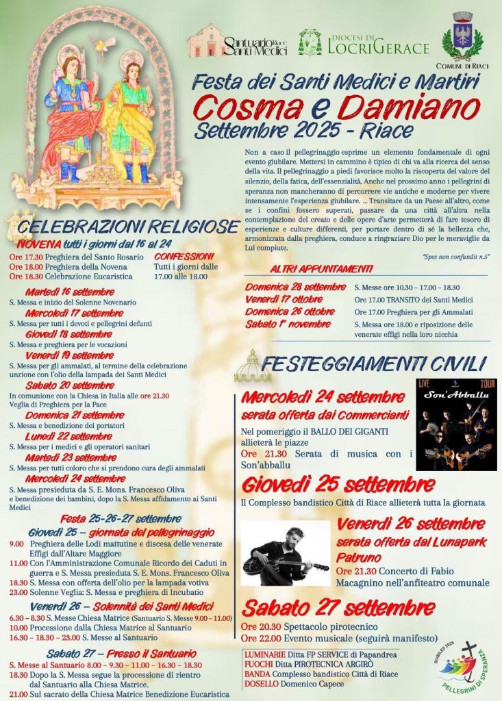Solenni festeggiamenti in onore dei Santi Medici e Martiri Cosma e Damiano, Patroni di Riace. Il programma prevede la Novena dal 16 al 24 settembre 2025 e la Festa nei giorni 25, 26 e 27 settembre 2025.