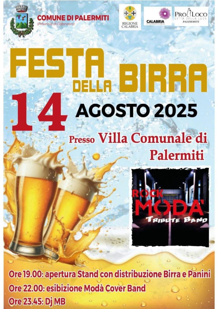 Festa della Birra a Palermiti, che si terrà il 14 agosto 2025 presso la Villa Comunale. Il programma prevede: ore 19:00, apertura stand con distribuzione di birra e panini; ore 22:00, esibizione della cover band dei Modà ‘Rock Modà’; ore 23:45, Dj set con Dj MB.