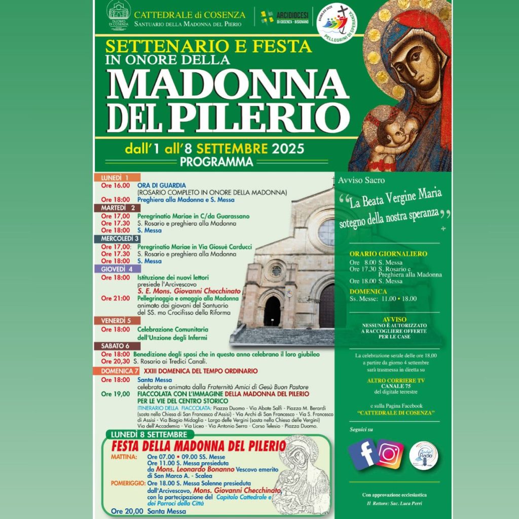 Settenario e Festa in onore della Madonna del Pilerio presso la Cattedrale di Cosenza, dall’1 all’8 settembre 2025. Il programma prevede celebrazioni religiose quotidiane. I festeggiamenti culminano lunedì 8 settembre con la Festa della Madonna del Pilerio, che include Sante Messe durante tutta la giornata e un concerto alle ore 20:00.