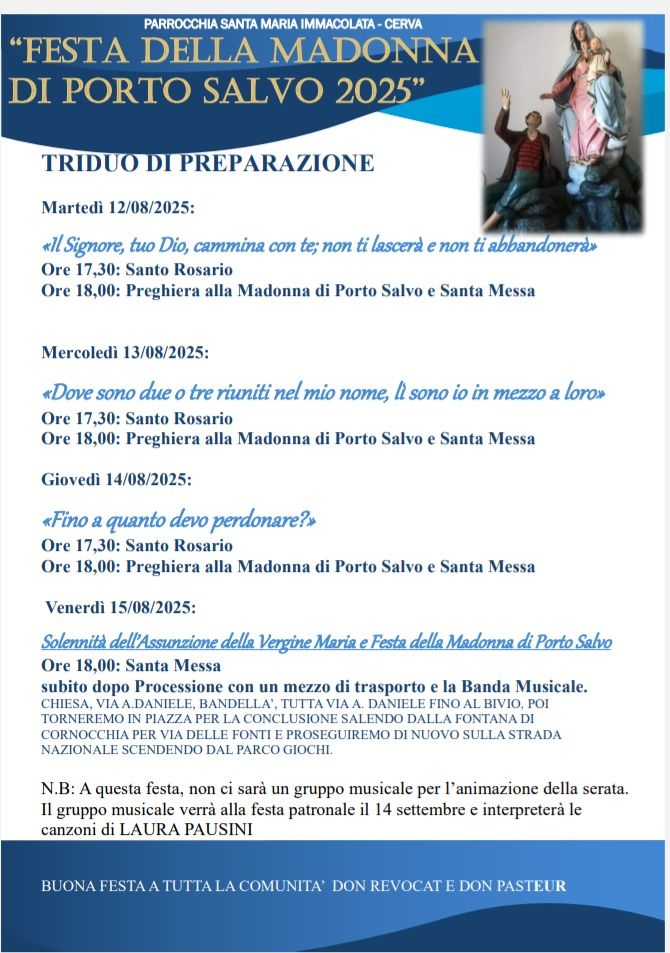 Festa religiosa in onore della Madonna di Porto Salvo a Cerva, organizzata dalla Parrocchia Santa Maria Immacolata. Il programma prevede un Triduo di Preparazione dal 12 al 14 agosto 2025, con Santo Rosario alle 17:30 e Preghiera alle 18:00. Venerdì 15 agosto, Solennità dell’Assunzione, si terrà la Santa Messa alle 18:00, seguita da una processione.