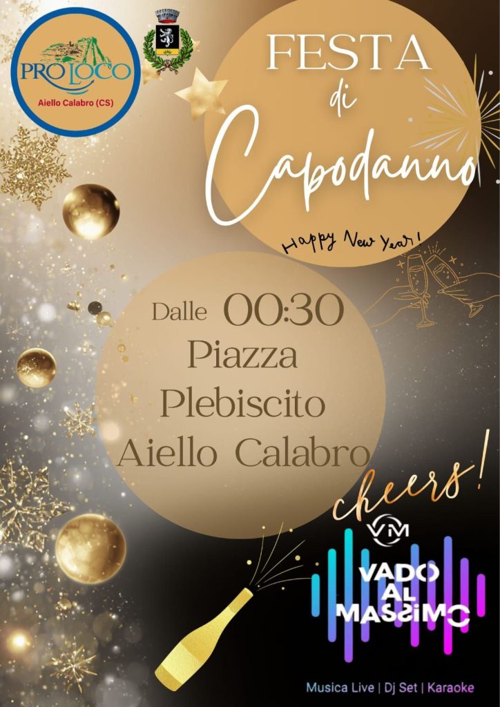 In occasione del nuovo anno, la Pro Loco e il Comune di Aiello Calabro organizzano la “Festa di Capodanno”. L’evento si terrà in Piazza Plebiscito a partire dalle ore 00:30. La serata sarà animata dal gruppo ‘Vado al Massimo’ con un intrattenimento che prevede musica live, DJ set e karaoke per festeggiare insieme l’inizio del nuovo anno.