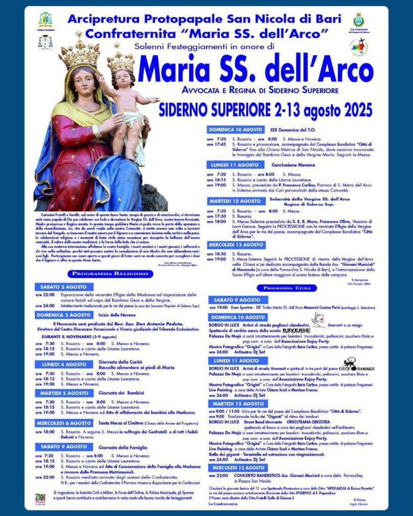 Festeggiamenti in onore di Maria SS. dell’Arco a Siderno Superiore, dal 2 al 13 agosto 2025. Il programma religioso e civile prevede numerose messe, processioni, concerti bandistici e spettacoli, con eventi principali ogni giorno.