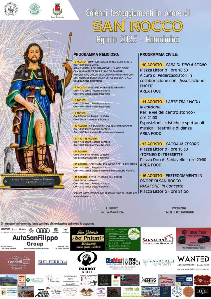 Festeggiamenti in onore di San Rocco ad Antonimina, dal 6 al 16 agosto 2025. Il programma civile prevede: 10 agosto Gara di Tiro a Segno; 11 agosto L’Arte tra i Vicoli; 12 agosto Caccia al Tesoro e Torneo di Tressette; 16 agosto alle 21:00 concerto dei Parafonè in Piazza Littorio.