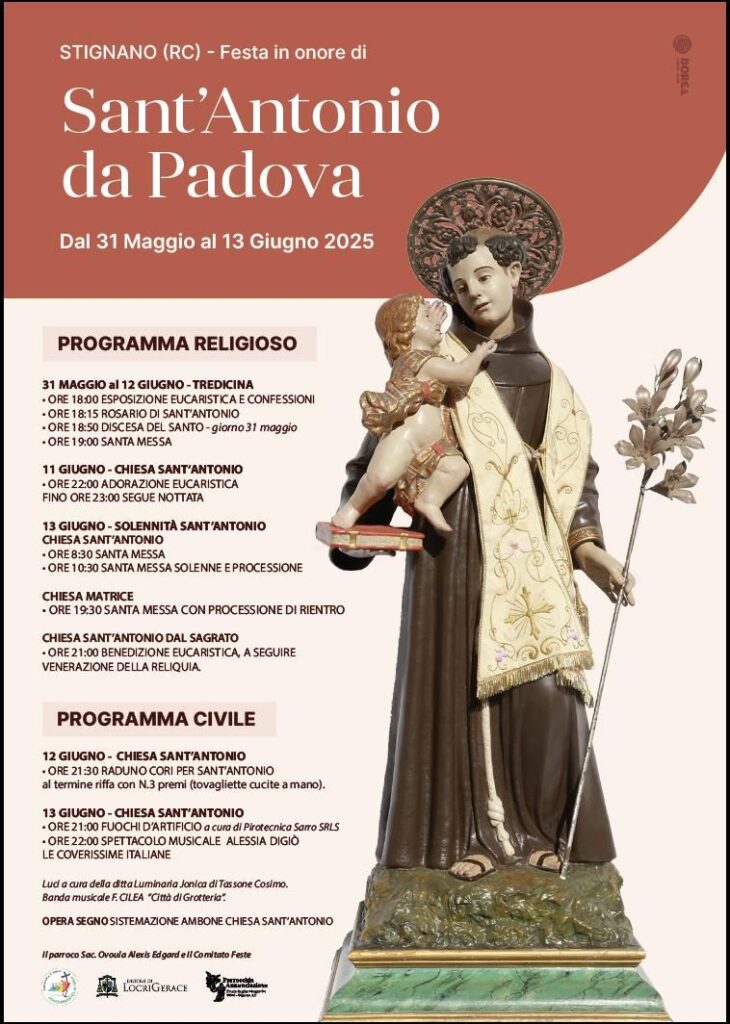 Festa in onore di Sant’Antonio da Padova a Stignano. La festa si svolge dal 31 maggio al 13 giugno 2025.