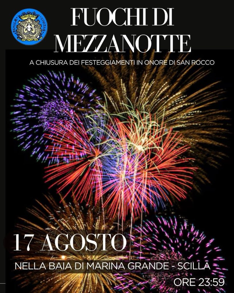 Spettacolo pirotecnico “Fuochi di Mezzanotte” a chiusura dei festeggiamenti in onore di San Rocco. L’evento si terrà il 17 agosto alle ore 23:59 nella baia di Marina Grande a Scilla.