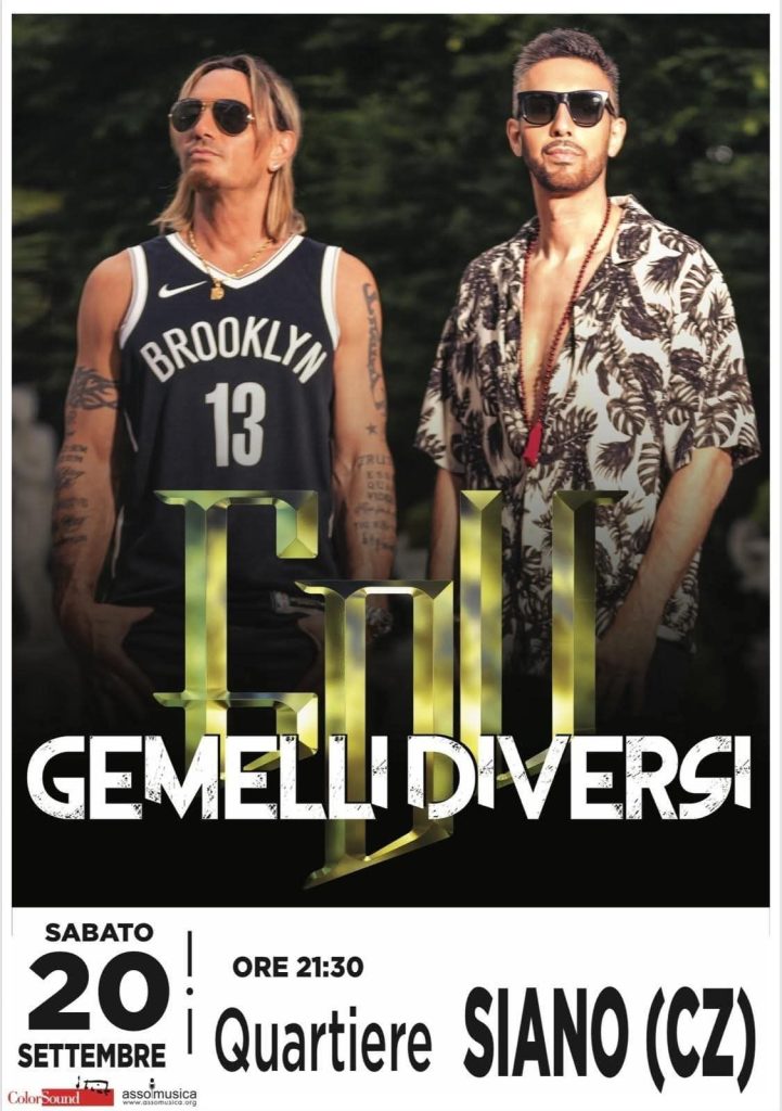 Concerto dei Gemelli Diversi che si terrà nel Quartiere Siano. L’evento promette una serata di musica e intrattenimento con l’esibizione del celebre duo.