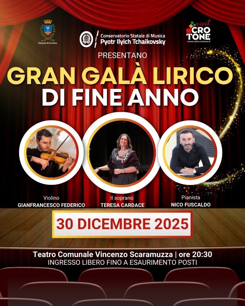 Il Comune di Crotone e il Conservatorio Statale di Musica Pyotr Ilyich Tchaikovsky presentano il ‘Gran Galà Lirico di Fine Anno’. L’evento, che si terrà presso il Teatro Comunale Vincenzo Scaramuzza, vedrà la partecipazione del violinista Gianfrancesco Federico, del soprano Teresa Cardace e del pianista Nico Fuscaldo. L’ingresso è libero fino ad esaurimento posti.
