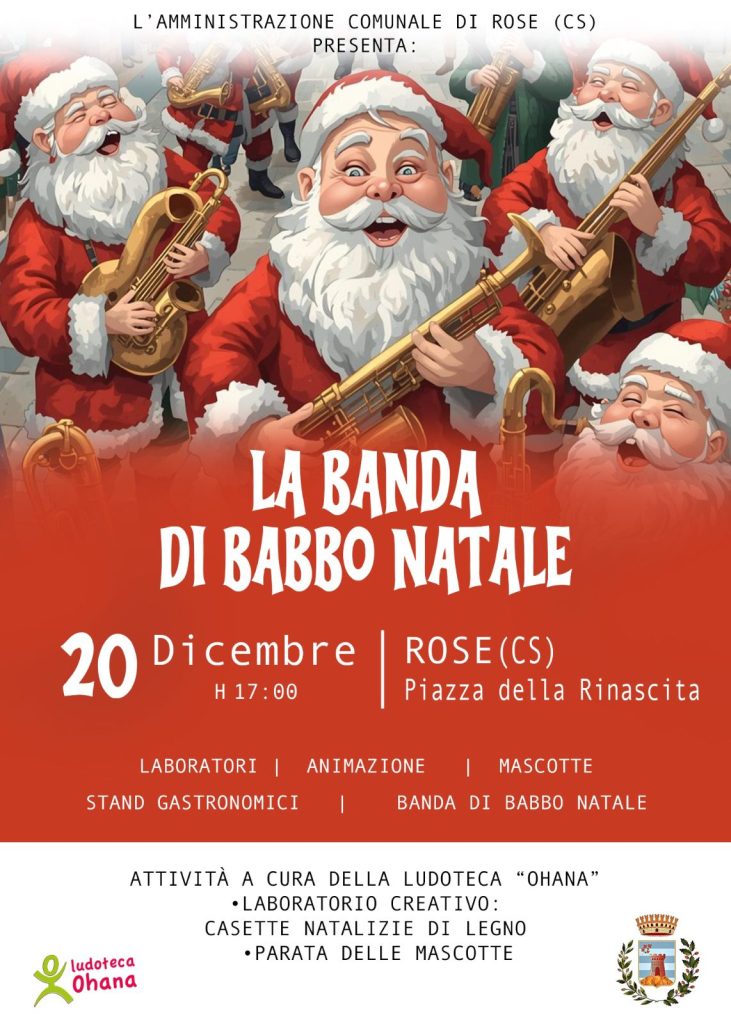 L’Amministrazione Comunale di Rose presenta un evento con laboratori, animazione, mascotte, stand gastronomici e la Banda di Babbo Natale. Le attività sono a cura della Ludoteca “Ohana” e includono un laboratorio creativo per la creazione di casette natalizie di legno e la parata delle mascotte.