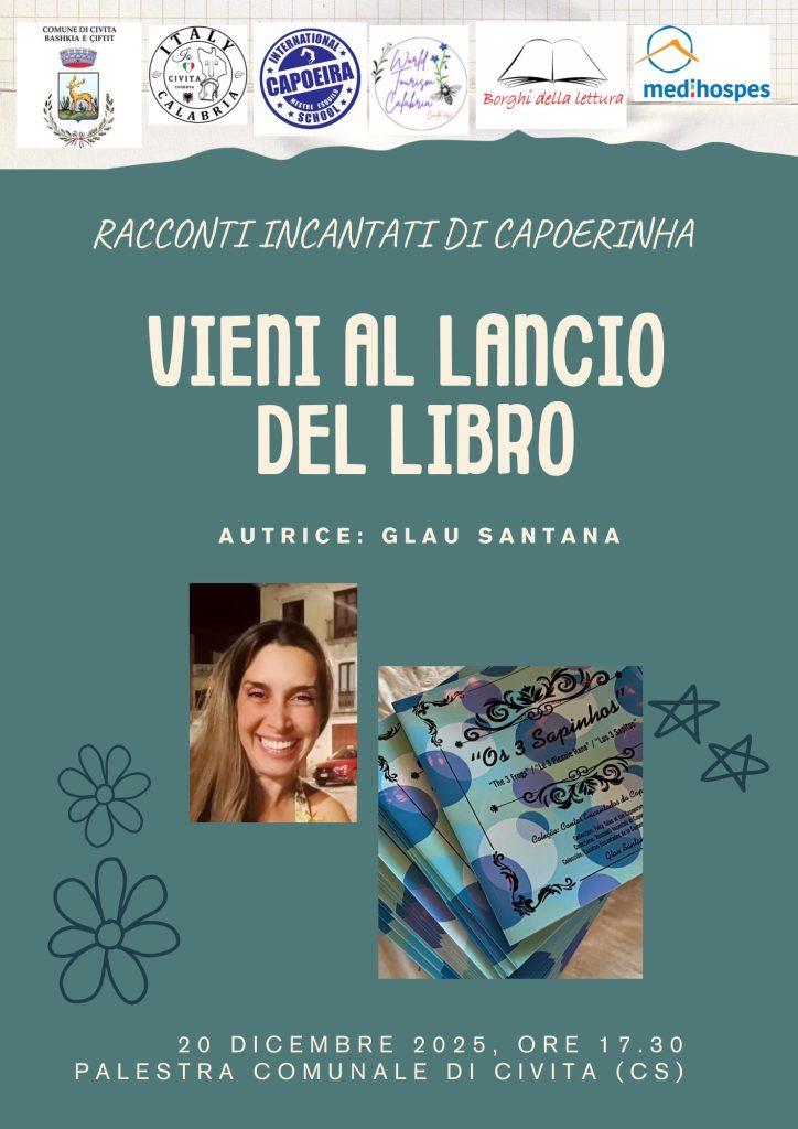 Evento di presentazione del libro ‘Racconti Incantati di Capoerinha’ scritto dall’autrice Glau Santana. Il lancio si svolgerà presso la Palestra Comunale di Civita. L’iniziativa è promossa con il patrocinio del Comune di Civita e in collaborazione con diverse organizzazioni, tra cui International Capoeira School, World Tourism Calabria, Borghi della Lettura e Medihospes.