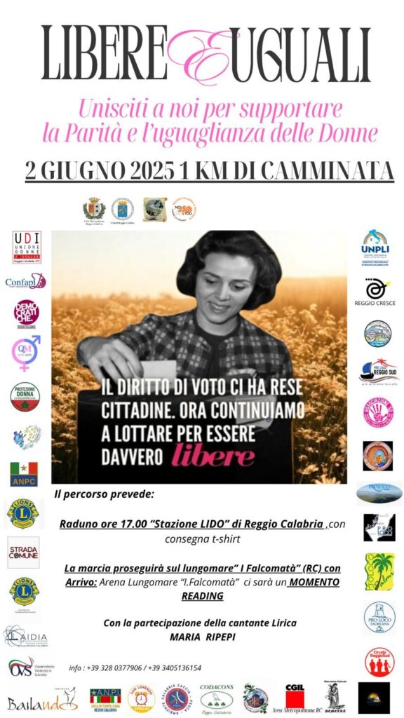 Marcia per supportare la parità e l’uguaglianza delle donne, che si svolge a Reggio Calabria. La marcia è di 1 km e prevede la partecipazione della cantante Lirica Maria Ripepi.