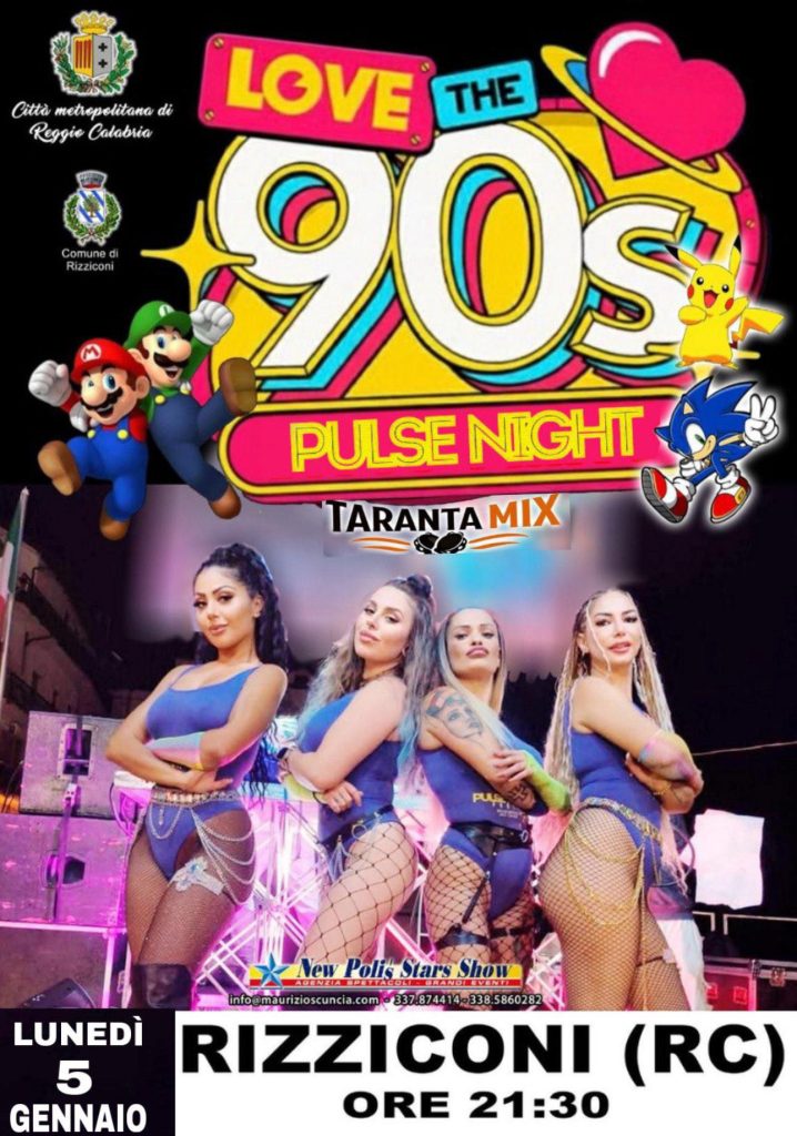 Serata di spettacolo e musica a tema anni ’90 intitolata ‘Love The 90s Pulse Night’. L’evento, patrocinato dalla Città Metropolitana di Reggio Calabria e dal Comune di Rizziconi, vedrà l’esibizione del ‘New Polis Stars Show’ e includerà un segmento speciale ‘Taranta Mix’.
