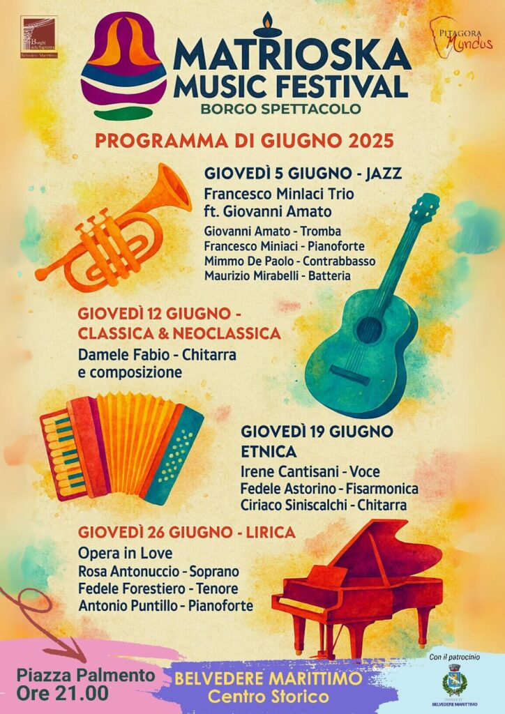 Festival musicale con diversi generi a Belvedere Marittimo, in Piazza Palmento, ore 21:00. Il 5 giugno Jazz con Francesco Miniaci Trio, il 12 giugno Classica e Neoclassica con Damele Fabio, il 19 giugno Etnica con Irene Cantisani e il 26 giugno Lirica con Rosa Antonuccio.