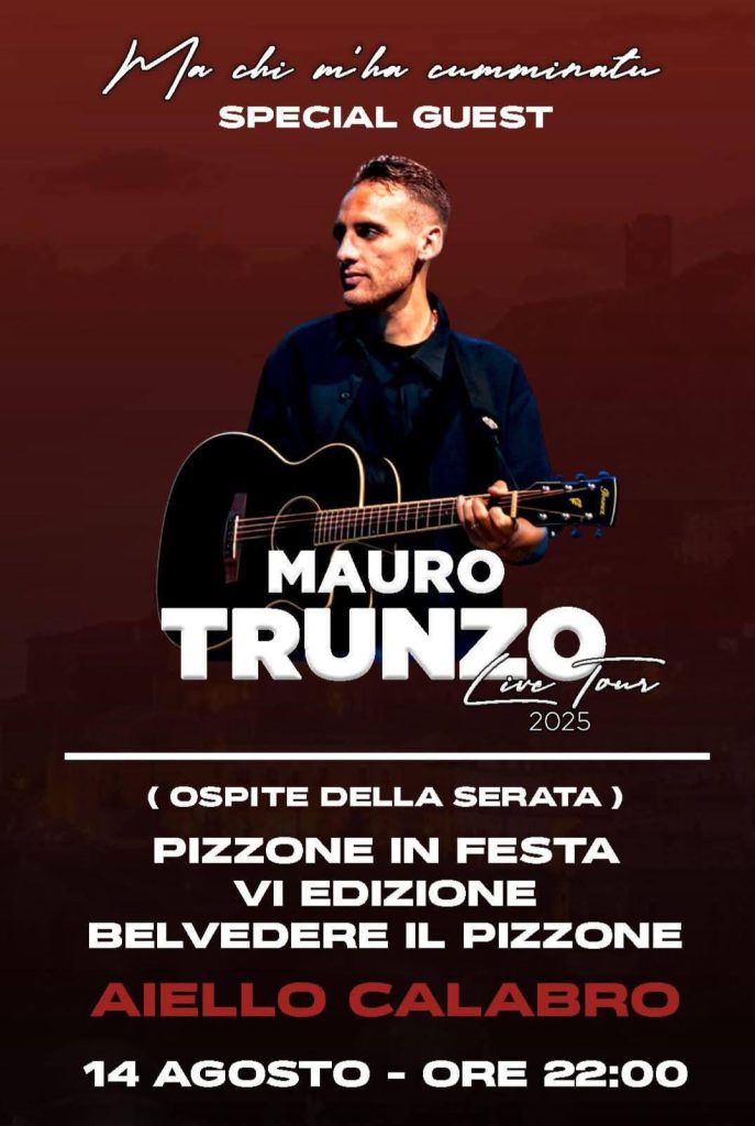 Concerto del cantautore Mauro Trunzo, ospite speciale della serata ‘Pizzone in Festa’. L’evento si terrà il 14 agosto 2025 presso il Belvedere il Pizzone ad Aiello Calabro, con inizio alle ore 22:00.