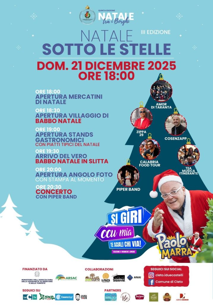 Terza edizione di ‘Natale Sotto le Stelle’ con un ricco programma: alle 18:00 apertura dei mercatini di Natale, alle 18:30 apertura del villaggio di Babbo Natale, alle 19:00 apertura degli stands gastronomici con piatti tipici. Alle 19:30 è previsto l’arrivo di Babbo Natale in slitta, seguito alle 20:00 dall’apertura di un angolo foto con stampa al momento. La serata si conclude alle 20:30 con il concerto della Piper Band. L’evento vedrà la partecipazione di Paolo Marra con lo spettacolo ‘Si Giri Ccu Mia’, Amor di Taranta, Zippa 29, Cosenzapp, Calabria Food Tour e Tea Musica Itinerante.