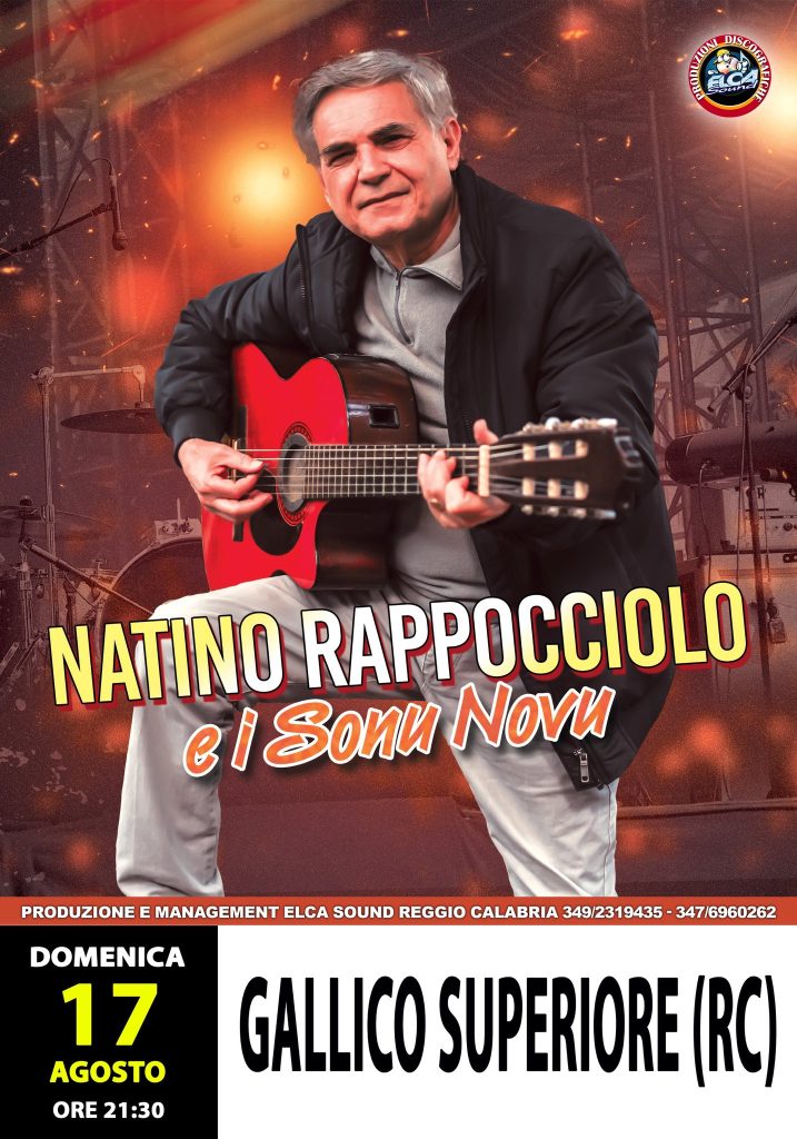 Concerto di Natino Rappocciolo e i Sonu Novu che si terrà domenica 17 agosto 2025 alle ore 21:30 a Gallico Superiore.