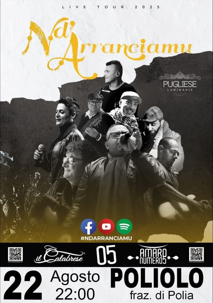 Concerto del gruppo musicale “Nd’Arangiamu” che si terrà il 22 agosto a Poliolo, frazione di Polia, con inizio alle ore 22:00.
