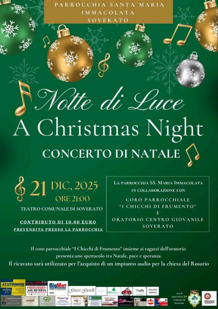 Concerto di Natale organizzato dalla Parrocchia Santa Maria Immacolata. Il coro parrocchiale “I Chicchi di Frumento” insieme ai ragazzi dell’Oratorio Centro Giovanile Soverato presentano uno spettacolo tra Natale, pace e speranza. Il ricavato sarà utilizzato per l’acquisto di un impianto audio per la chiesa del Rosario. Contributo di 10,00 euro, prevendita presso la Parrocchia.