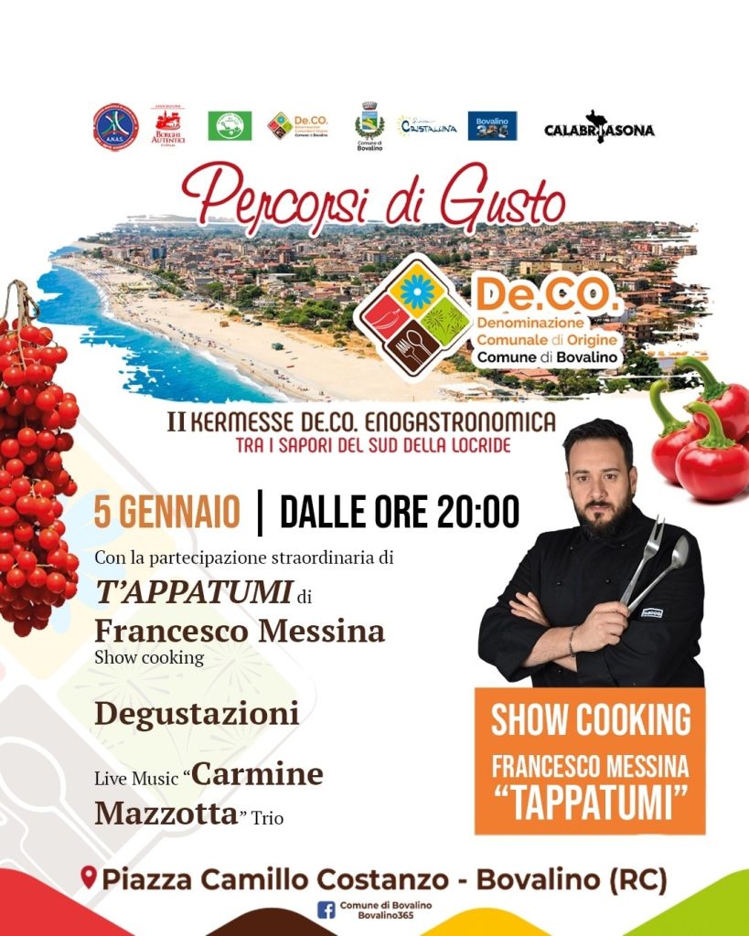 Seconda edizione della kermesse enogastronomica “Percorsi di Gusto”, un evento dedicato alla scoperta dei sapori del sud della Locride. La serata prevede degustazioni di prodotti tipici, uno show cooking con la partecipazione straordinaria di Francesco Messina, noto come “T’appatumi”, e intrattenimento con la musica dal vivo del “Carmine Mazzotta” Trio.
