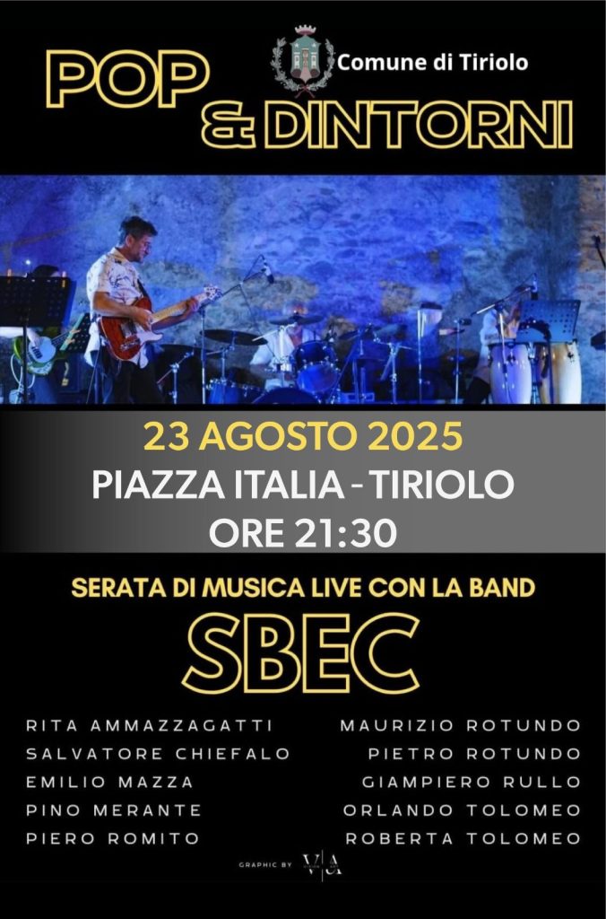 Serata di musica live con la band SBEC nell’ambito della rassegna “Pop & Dintorni”. Il concerto si terrà il 23 agosto 2025 in Piazza Italia a Tiriolo.