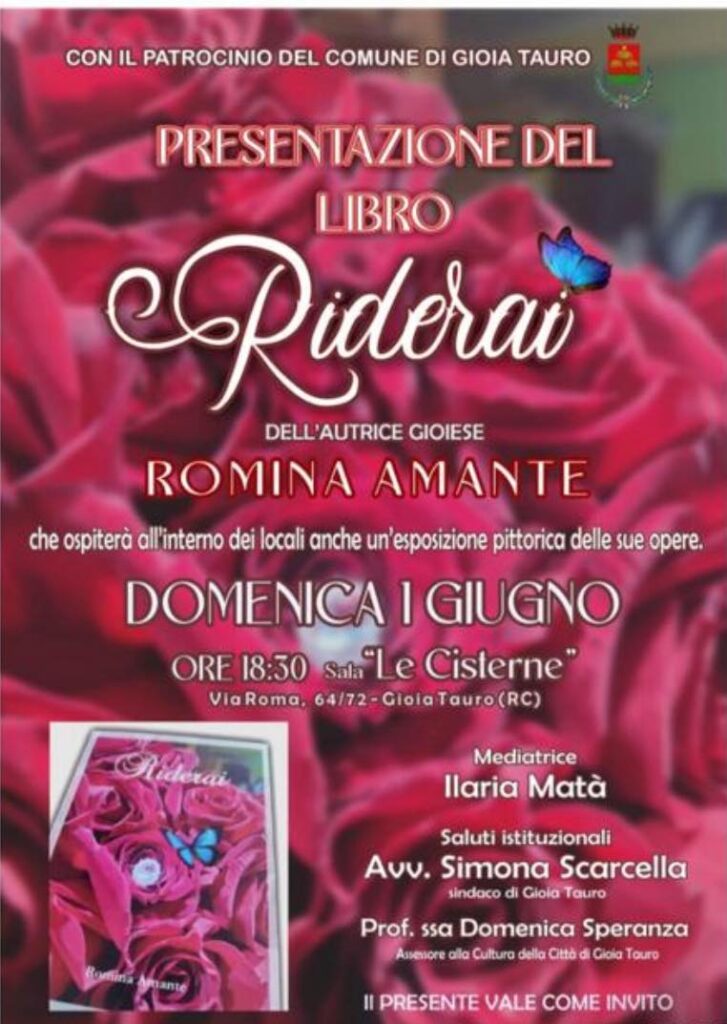 Presentazione del libro “Riderai” dell’autrice Romina Amante, con esposizione pittorica delle sue opere. L’evento si terrà presso la Sala “Le Cisterne” a Gioia Tauro e vedrà la partecipazione di Ilaria Matà come mediatrice, e i saluti istituzionali di Avv. Simona Scarcella (sindaco di Gioia Tauro) e Prof.ssa Domenica Speranza (Assessore alla Cultura della Città di Gioia Tauro).