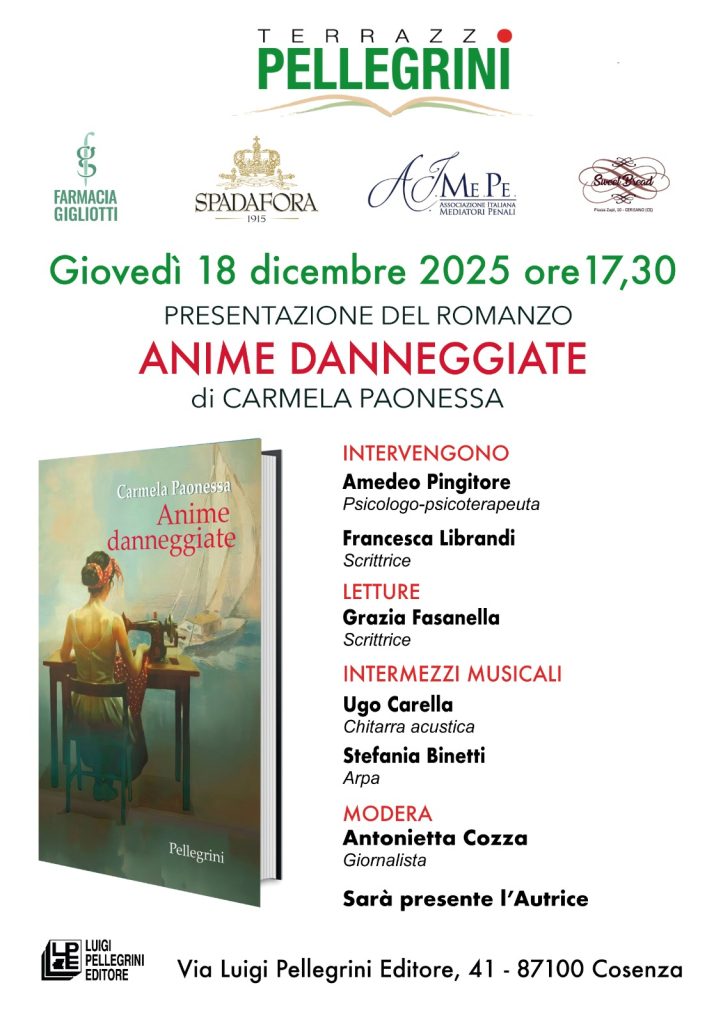 Presentazione del romanzo ‘Anime Danneggiate’ di Carmela Paonessa. Intervengono Amedeo Pingitore, Francesca Librandi. Letture di Grazia Fasanella. Intermezzi musicali con Ugo Carella e Stefania Binetti. Modera Antonietta Cozza. Sarà presente l’autrice.