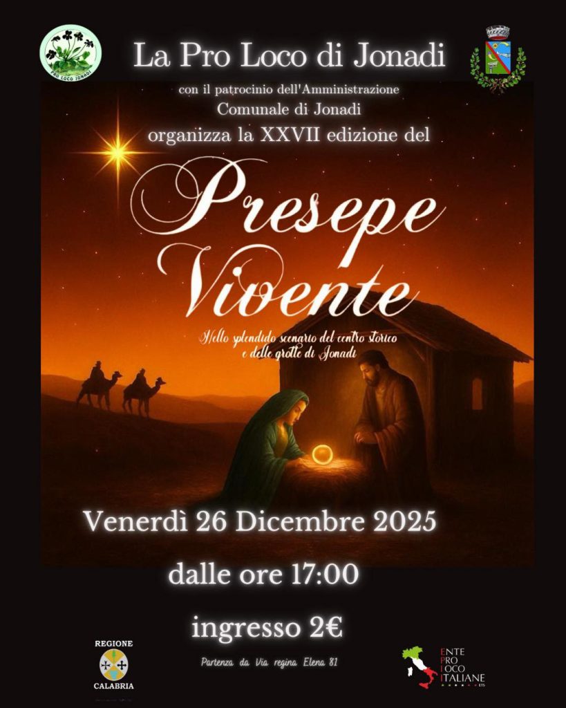 La Pro Loco di Jonadi, con il patrocinio dell’Amministrazione Comunale di Jonadi, organizza la XXVII edizione del Presepe Vivente. L’evento si svolge nello splendido scenario del centro storico e delle grotte di Jonadi. Partenza da Via regina Elena 81. Ingresso 2€.