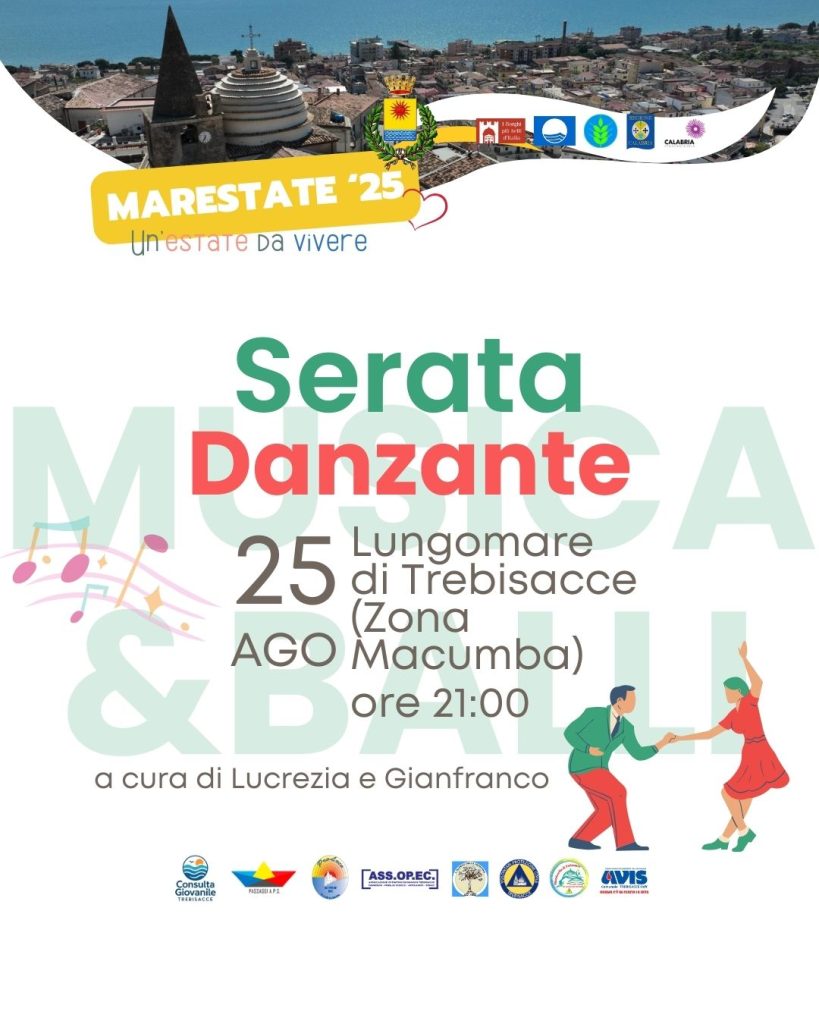 Serata danzante a cura di Lucrezia e Gianfranco, inserita nel programma “Marestate ’25”. L’evento si terrà il 25 agosto sul Lungomare di Trebisacce, in zona Ago Macumba.