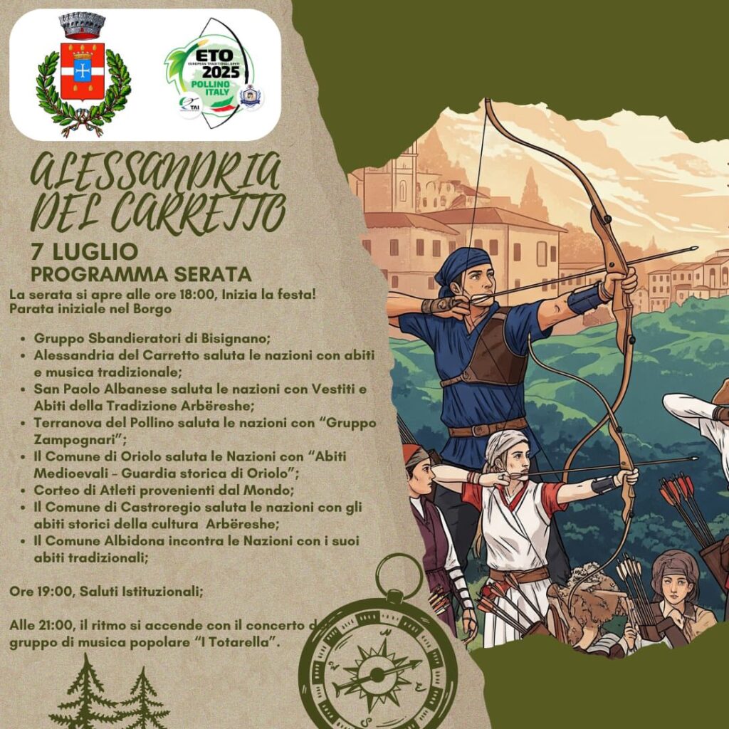 Serata di festa nel borgo di Alessandria del Carretto il 7 luglio. L’evento inizia alle 18:00 e prevede una sfilata di gruppi in abiti tradizionali e storici, tra cui gli Sbandieratori di Bisignano e rappresentanze dei comuni Arbëreshë. Alle 19:00 si terranno i saluti istituzionali. La serata si concluderà alle 21:00 con il concerto di musica popolare del gruppo ‘I Totarella’.