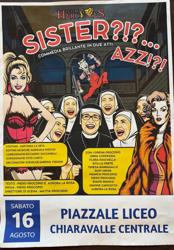 Commedia brillante in due atti intitolata “Sister?!? … Azz!!”, presentata dal Teatro Hercules. Lo spettacolo si terrà sabato 16 agosto 2025 presso il Piazzale Liceo a Chiaravalle Centrale.