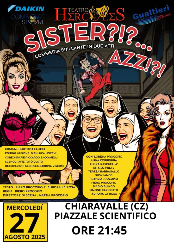 Commedia brillante in due atti “Sister?!?… Azz!?!” presentata dal Teatro Hercules. Lo spettacolo si terrà mercoledì 27 agosto 2025 presso il Piazzale Scientifico a Chiaravalle.