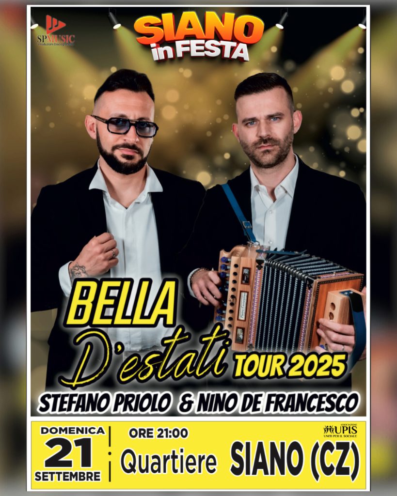 Concerto del duo musicale Stefano Priolo & Nino De Francesco, tappa del loro ‘Bella D’estati Tour 2025’. L’esibizione si terrà in occasione dell’evento ‘Siano in Festa’ nel quartiere Siano.