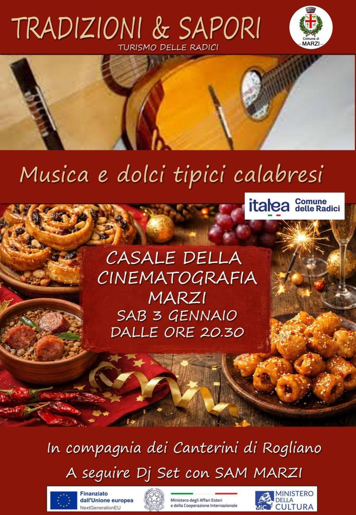 Serata dedicata alle tradizioni calabresi con degustazione di dolci tipici e intrattenimento musicale. L’evento, inserito nel progetto “Turismo delle Radici”, prevede l’esibizione del gruppo folk “i Canterini di Rogliano”, seguita da un DJ set con Sam Marzi.
