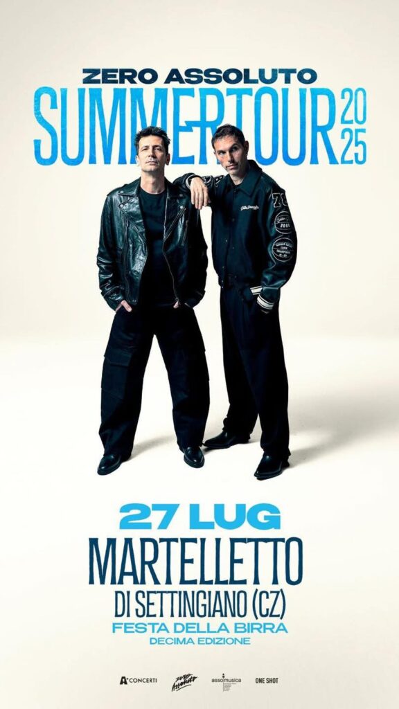 Concerto degli Zero Assoluto nell’ambito del loro Summer Tour 2025, che si terrà il 27 luglio 2025 a Martelletto di Settingiano, in occasione della Decima Edizione della Festa della Birra.
